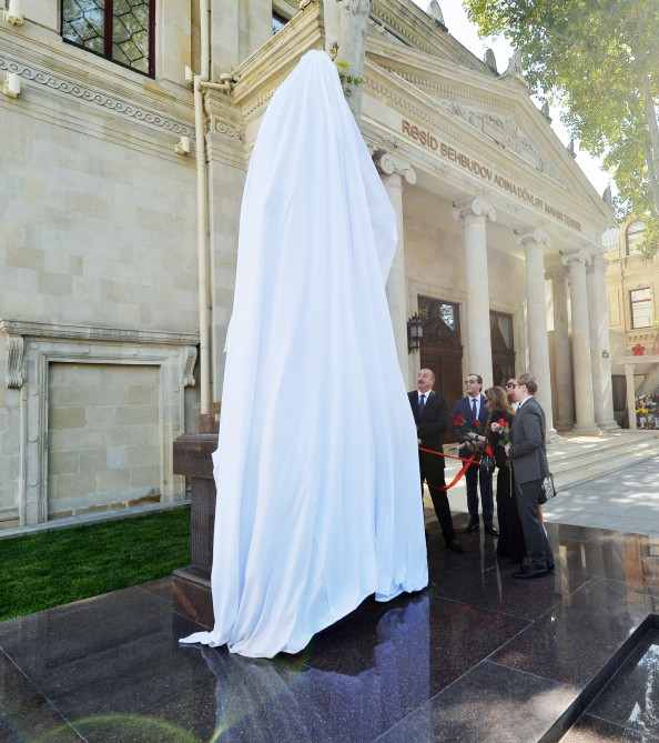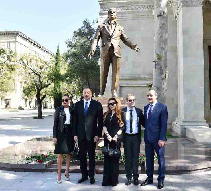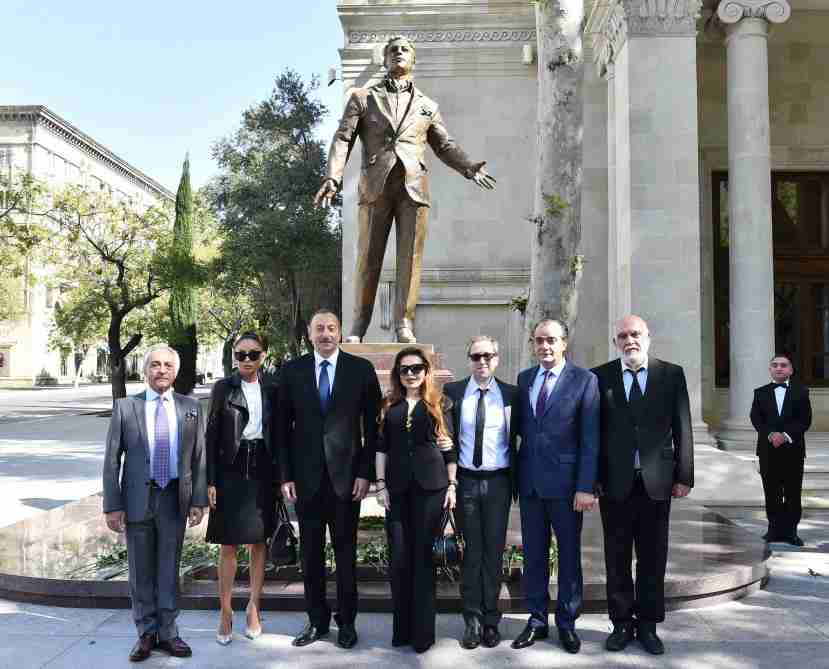 Prezident İlham Əliyev xanımı Mehriban Əliyeva və məşhur müğənninin ailə üzvləri ilə birlikdə heykəlin üzərindəki örtüyü götürdü.