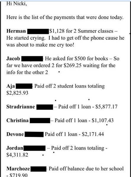 Nəticədə izləyiciləri öz qiymətlərini göstərmiş və ehtiyacı olan məbləği bildirmişdi. Sənətçi isə ondan kömək istəyən bütün tələbələrə lazım olan məbləği ödəyərək "İnstagram" səhifəsində paylaşıb.
