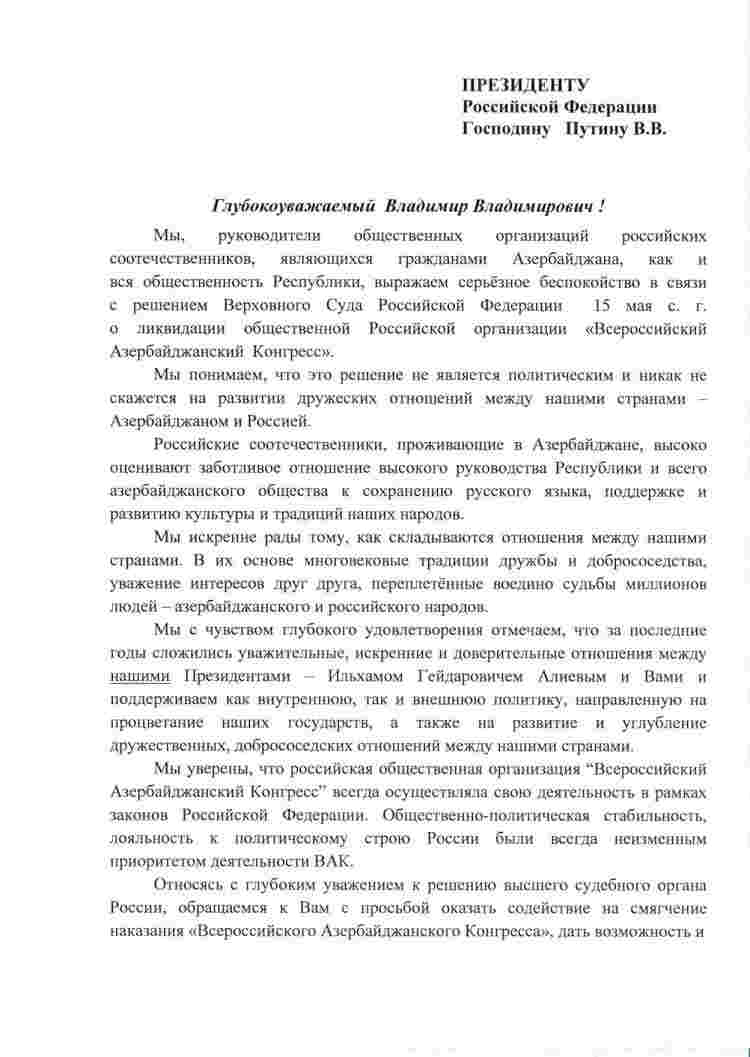Müraciətdə bildirilir ki, son illər iki ölkə prezidenti arasında qarşılıqlı ehtiram, səmimiiyyət və etimad əlaqələri formalaşıb: "Biz ölkələrimizin inkişafına yönəlmiş daxili və xarici siyasəti, həmçinin iki ölkə arasında dost və qonşuluq münasibətlərinin inkişafı və dərinləşməsinə yönəlmiş siyasəti dəstəkləyirik. Əminik ki, Ümumrusiya Azərbaycan Konqresi hər zaman öz fəaliyyətini Rusiya qanunları çərçivəsində həyata keçirib. Rusiyada ictimai-siyasi sabitlik, ölkənin siyasi quruluşuna loyallıq təşkilatın fəaliyyətinin dəyişməz prioriteti olub. Ali Məhkəmənin qərarına dərin hörmətlə yanaşaraq sizdən xahiş edirik ki, məhkəmənin qərarının yumşaldılması və ÜAK-ın fəaliyyətindəki təşkilati və digər çatışmazlıqların aradan qaldırılması, yeni Nizamnamənin qəbuluna təkan verəcək növbədənkənar qurultayının çağırılması üçün imkan və zamanın verilməsinə köməklik göstərəsiniz.