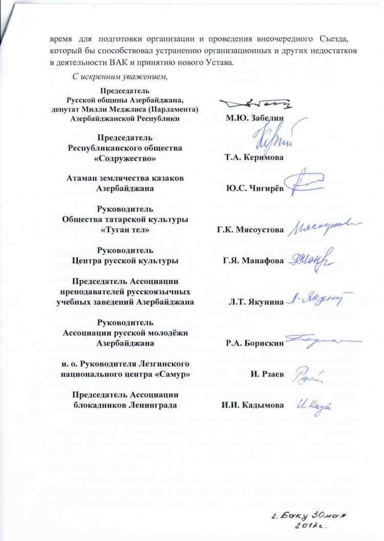 Sənədi Azərbaycandakı Rus İcmasının sədri, Milli Məclisin üzvü Mixail Zabelin, "Sodrujestvo" Respublika Cəmiyyətinin, Rus Mədəniyyət Mərkəzinin, Azərbaycanın Rusdilli Təhsil Müəssisələri Müəllimlərinin Assosiasiyasının, Azərbaycan Rus Gəncliyi Assosiasiyasının, "Samur" Ləzgi Milli Mərkəzinin, Leninqrad Mühasirəsi İştirakçıları Assosiasiyasının, "Tuqan Tel" Tatar Mədəniyyət Cəmiyyətinin rəhbərləri, eləcə də Azərbaycan kazaklarının atamanı imzalayıblar.